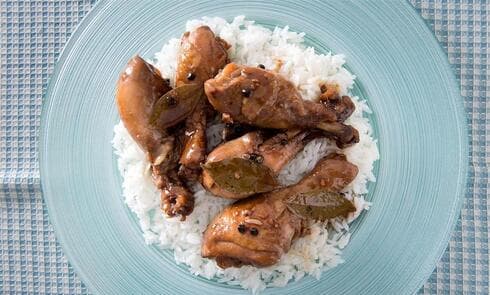 4. מוציאים את העוף ושומרים במקום חם. מסלקים את עלי הדפנה מהנוזלים שהצטברו בסיר ומגבירים את האש. מצמצמים את הנוזלים לחצי ומחזירים את חלקי העוף. מחממים מחדש והופכים את השוקיים ברוטב כך שיצופו היטב ברוטב המצומצם. זורים את הכוסברה ומגישים על מצע של אורז לבן.