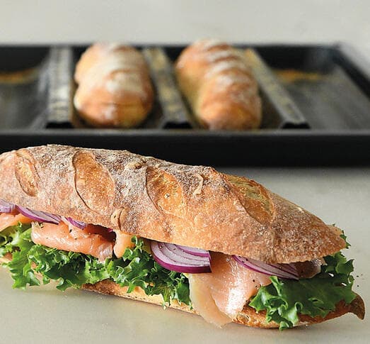 10. מוציאים את התבנית עם המים ואופים במשך 10–15 דקות נוספות או עד שהבאגטים זהובים.