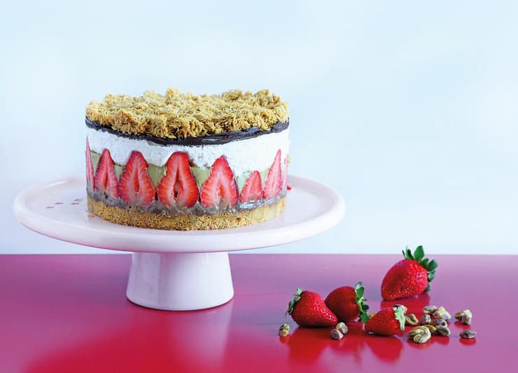 בכל שנה, במדור שסוגר את השנה האזרחית, אני מכינה לי ולכם עוגה שתביא איתה ברכה ומתיקות לשנה הבאה. השנה בחרתי לשלב את טרנד דובאי ביחד עם עוגת גבינה קרה וכל כך ישראלית, ובתוכה תותים מרמת הגולן ושוקולד מריר וחלב שמיוצר בארץ. קצת מחו"ל, הרבה מפה, ובעיקר עם תקווה לשנה טובה.
