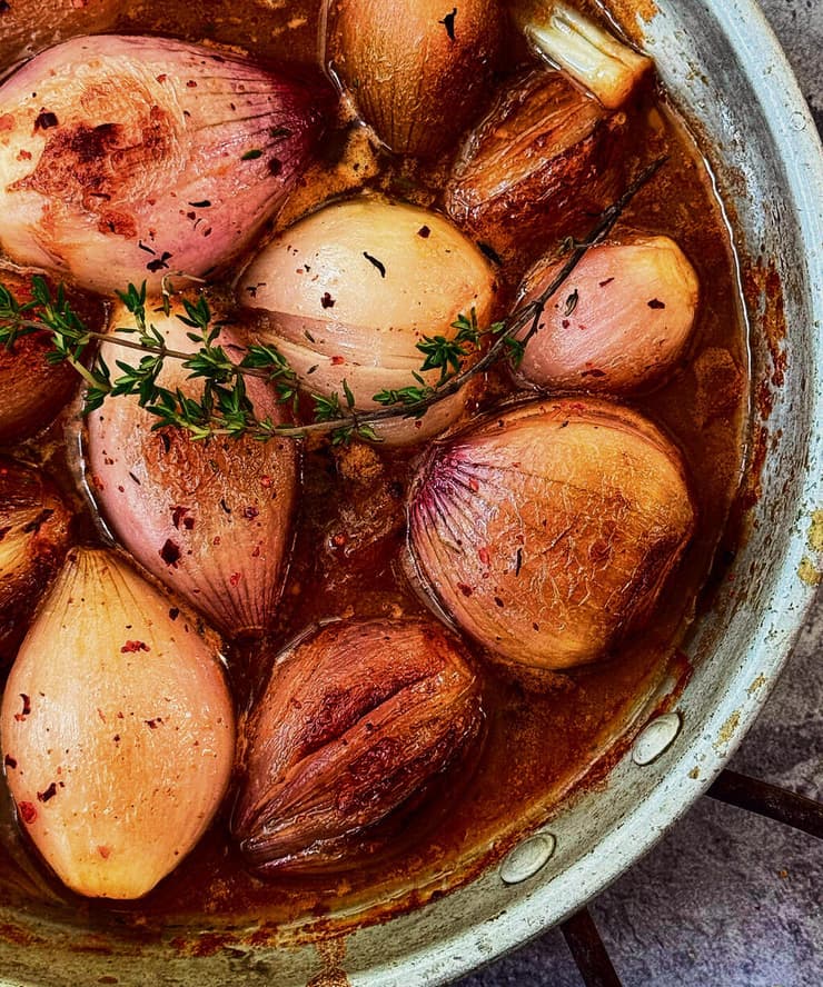 3. מוסיפים כמה ענפי התימין, מכסים עם מכסה או עם נייר אלומיניום ושולחים לתנור בחום בינוני (180 מעלות) ל-25 דקות. כ-10 דקות לתוך הצלייה פותחים והופכים את הבצלצלים ברוטב. הם מוכנים כשהם רכים לחלוטין והרוטב סמיך ומבריק.