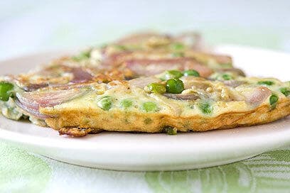 - טורפים בקערה ביצים, מלח ופלפל, בעזרת מטרפה ידנית או מזלג. מוסיפים את האפונה והבצל מהמחבת לקערה ובזריזות מוסיפים 2 כפות שמן זית למחבת, מגבירים את הלהבה ויוצקים את כל התערובת למחבת. מטגנים כחצי דקה עד דקה.