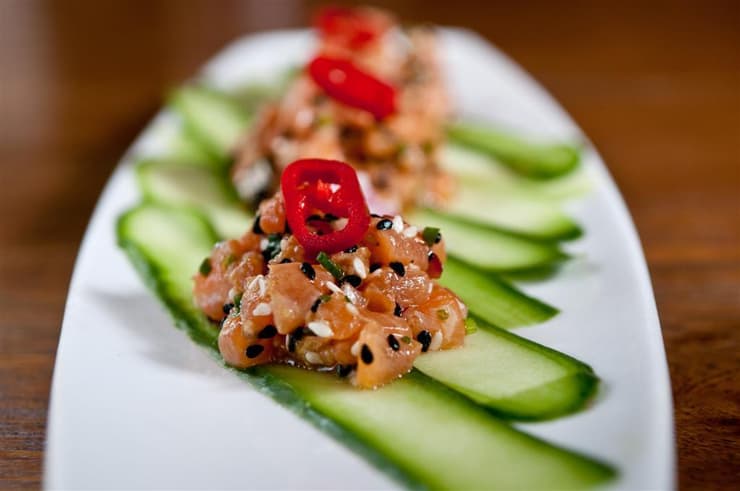 - מערבבים את כל המרכיבים ומגישים מיד על מצע קליפות המלפפון.