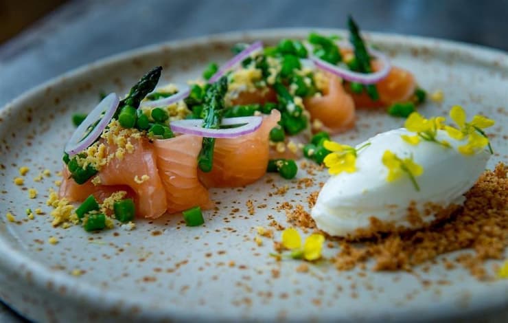 - מוציאים את האספרגוסים ממי הקרח ומייבשים. קוצצים דק, מתבלים בשמן זית, מיץ לימון סחוט טרי ומלח ומפזרים מעל הסלמון הכבוש.