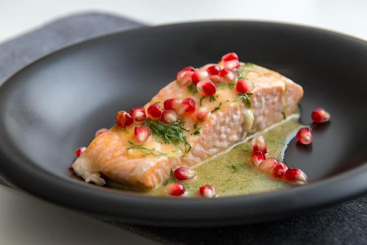 - מכינים את הסלמון - שמים את הסלמון בסיר ביחד עם כל המרכיבים ומבשלים על אש נמוכה במשך 15 דקות (ללא רתיחה) עד שהסלמון רך ונימוח. הבישול צריך להיות עדין ואיטי כדי שהדג יישמר עסיסי ולא יתייבש. מעבירים את הסלמון לצלחת נפרדת ומניחים בצד כדי שהדג יתקרר ויגיע לטמפרטורת החדר (שימו לב: חשוב לא להכניס את הסלמון למקרר, כדי שהשומן לא יתקשה).