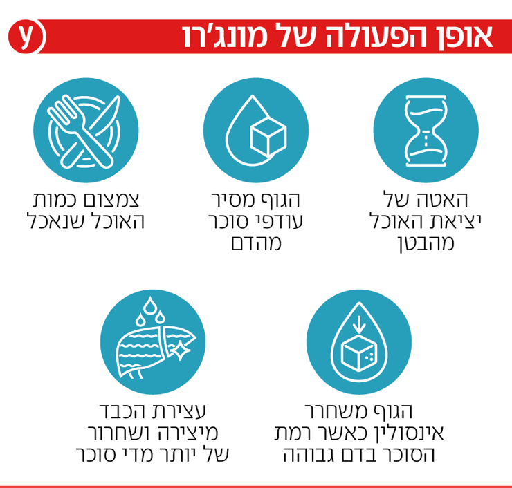 זריקת מונג'רו מאושרת על ידי ה-FDA (מנהל המזון והתרופות האמריקני) לטיפול בסוכרת מסוג 2 בקרב מבוגרים, והיא משמשת גם לטיפול בהשמנת יתר בקרב בני 18 ומעלה ומשפיעה על תחושת השובע, ויסות התיאבון ועל ויסות ואיזון רמות הסוכר בדם. התרופה מכילה את החומר הפעיל טירזפטייד, שבדומה לתרופות האחרות מחקה את ההורמון GLP1, אך פועלת במנגנון נוסף גם על ההורמון GIP, ובכך מציגה יעילות קלינית גבוהה.