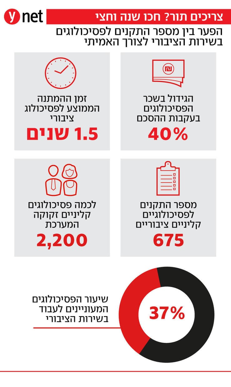 "במערכת הבריאות הציבורית יש עומסים בלתי נסבלים, במיוחד לאחר 7 באוקטובר", אומר פסיכולוג בתפקיד ניהולי במערכת הבריאות בשיחה עם ynet. "אנחנו עובדים תחת אחריות עצומה לאנשים מאוד פגועים, עם סימפטומים שכמעט לא ראינו מבחינת העוצמה שלהם. התמונה היא קטסטרופלית - מאות ממתינים לתורים, והתקינה אינה משתנה. יש צורך בהוספה של אנשי מקצוע כדי לעזור לנו לשרוד את היום, השבוע, החודש". לדבריו, הפערים בין מספר הפסיכולוגים הנדרשים לעומת מספר התקנים בפועל גדולים מאוד. "אנחנו משוועים לכוח אדם", הוא טוען.