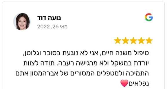 "שבועיים אחרי הטיפול התחלתי לישון טוב, נעלם הדחף למתוק והגוף היה שקט. שקט שאי אפשר להסביר, אלא לחוות. הגמילה החזירה לי את השליטה בחיי ושחררה אותי מההתמודדות עם חשקים מבוקר עד לילה.