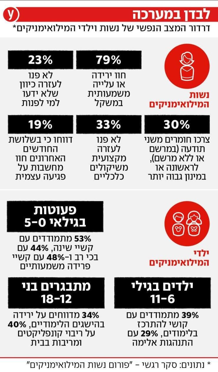 לדבריה, "בפסיכולוגיה הציבורית יש רשימות המתנה כאורך הגלות, ובשוק הפרטי טיפול אחד עולה לפחות 300 שקלים. יש לי ארבעה ילדים, מאיפה אני אביא סכומים כאלה?". לא מדובר על מקרה נקודתי, ונראה שלא חל שיפור משמעותי במצבם של בני המשפחה של המילואימניקים מאז הסקר האחרון שפורסם ב-ynet ו"ידיעות אחרונות" בדצמבר אשתקד. שמונה חודשים לאחר מכן, נתונים חדשים מתוך סקר "פורום נשות המילואימניקים" שנאספו על ידי החוקרת מור קיש מצביעים על שחיקה שהולכת וגדלה בקרב משפחות המילואים.