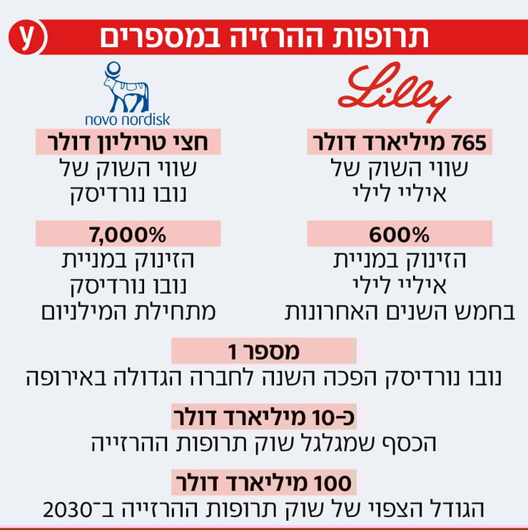 החברה הדנית מחזיקה בשני המותגים המובילים בתחום: ויגובי ואוזמפיק. איליי לילי היא המפתחת של התרופה מונג'רו, שנתח השוק שלה גדל בהתמדה. עשרות חברות נוספות נמצאות במרוץ הזה. כשמביטים בתוצאות העסקיות של נובו נורדיסק ואיליי לילי לא קשה להבין למה. נובו נורדיסק, שנוסדה לפני כמאה שנה והייתה חברה צנועה, הפכה תוך זמן קצר לאימפריה כלכלית מטורפת. היא נחשבת כיום לחברה הגדולה באירופה מבחינת שווי השוק שלה — כחצי טריליון דולר.