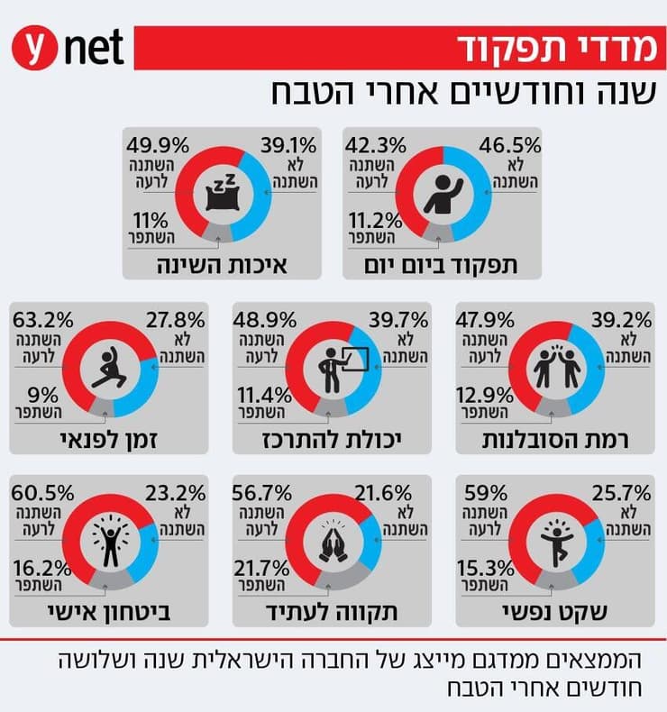 "צריך לזכור שגם אז הראינו שיעורים גבוהים הרבה יותר מאוכלוסיית אירופה כולה, כלומר, הגענו לטבח כאוכלוסייה בטראומה. ההבנה שלי מהנתונים לאורך כל המדידות, היא שיותר מאשר עיבדנו את האירועים ולאט-לאט הצלחנו להתמודד ולהתגבר - עשינו פעולה של הכחשה, של להעלים את מה שקרה. הציבור מאוד-מאוד מודאג ומתקשה בתפקוד. במחקרים שלנו אנחנו שואלים על מדדי תפקוד מגוונים: סבלנות, זמן עם הילדים או ריכוז בעבודה, טיב השינה וכמות הזמן שאנשים מבלים עם חברים. אנחנו רואים אחוזים מאוד גבוהים של קושי בביצוע המטלות היומיומיות הללו. כמעט שנה וחצי אחרי תחילת המלחמה, כ-60% מהנשאלים מדווחים על הרעה משמעותית במאפיינים האלה".