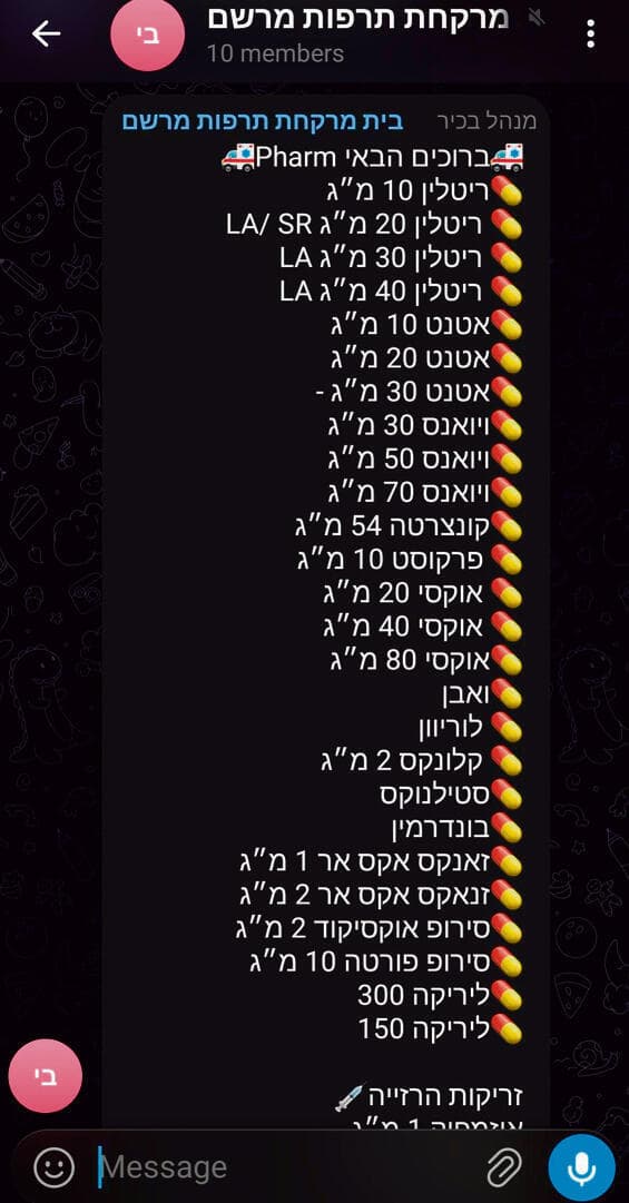 "הרופא הטוב" ממש לא לבד. לצידו פועלים בטלגרם גם "ערוץ הבריאות", "ד"ר דובי", "הרוקח המרכזי" ועוד רבים אחרים. רובם, תוך כמה לחיצות כפתור והליך שמכונה "אימות" (שבו הלקוח יידרש לשלוח צילום תעודת זהות, וצילום או סרטון סלפי), יספקו מיידית - עם שליח או באיסוף עצמי - כמעט כל תרופת מרשם אפשרית: מגלולות הרגעה ושינה, דרך שלל כדורי הקשב והריכוז ועד לאופיואידים הקשים. השוק השחור של התרופות בישראל פורח – ובעת מלחמה אפילו עוד יותר.