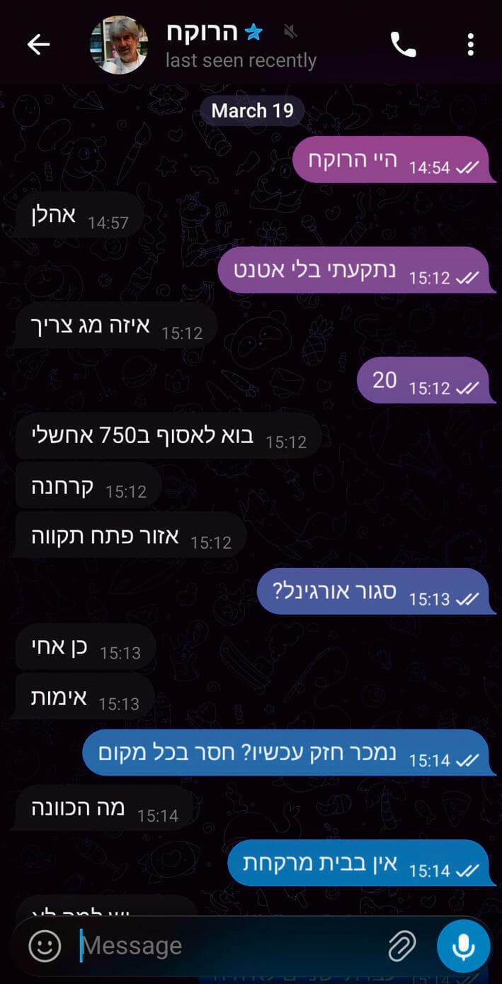 "מתי שתרצי מאמי. את מגיעה לאסוף? צריך אימות: סרטון סלפי עגול עם כסף מזומן (להגיד 'מנהל הזמנות', תאריך ושעה), צילום תעודת זהות, צילום מסך של רשת חברתית, מספר טלפון לתיאום".