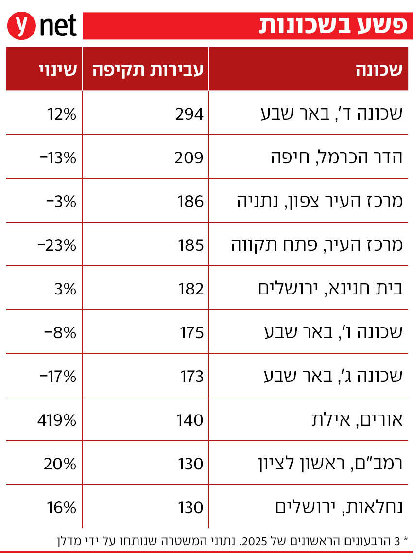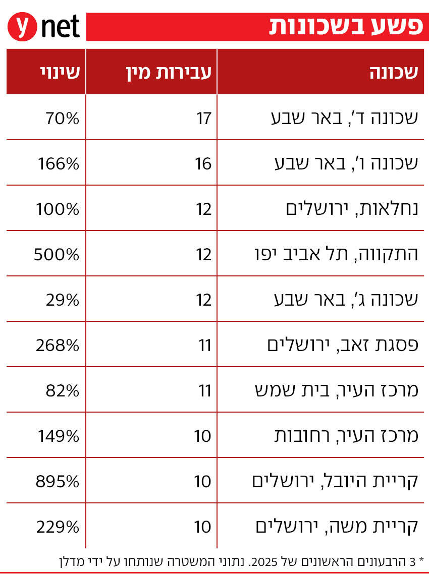 מבט מעמיק על השכונות שבהן בוצעו העבירות מראה גם את העלייה הגדולה במספר עבירות המין. אם ב-2024 שכונה ד' בבאר שבע הייתה היחידה עם 10 עבירות מין בשלושת הרבעונים הראשונים, השנה בכל 10 השכונות הראשונות יש מספר זהה או גבוה מכך. ברשימה העגומה שלוש שכונות מבאר שבע (ד', ו' ו-ג') וארבע מירושלים (נחלאות, פסגת זאב, קריית היובל וקריית משה).