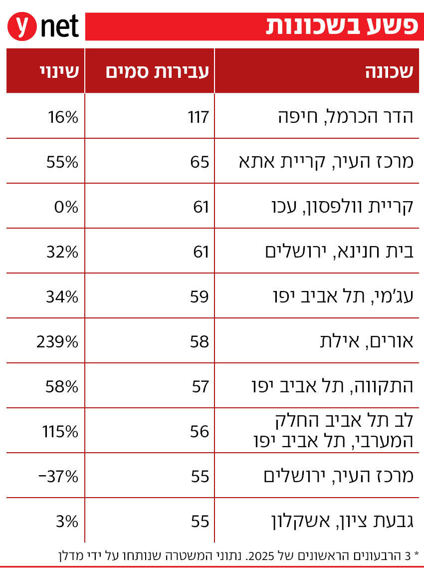 זה המצב בהדר הכרמל, שמובילה מהצד הלא נכון את רשימת עבירות הסמים – עם כמעט פי 2 מכל שכונה אחרת. מרכז קריית אתא במקום השני, בעקבות עלייה גדולה של 55% ביחס ל-2025, ואחר כך קריית וולפסון בעכו, בית חנינא בירושלים ועג'מי בתל אביב.