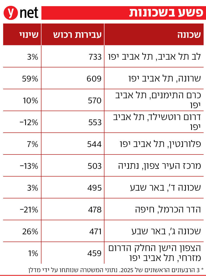 אחריהן ברשימה: מרכז העיר צפון בנתניה, שכונה ג' בבאר שבע ופלורנטין ודרום רוטשילד בתל אביב. פרט ללב תל אביב, עלייה מדאיגה במספר העבירות הכולל נראתה גם בשכונות נוספות בעיר ובהן פלורנטין, שרונה ויד אליהו. הרשימה המלאה: בתחילת הכתבה.