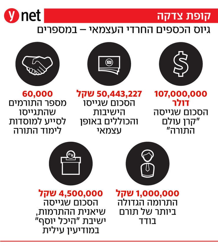 בזירת המוסדות, ישיבת "היכל יוסף" במודיעין עילית מובילה בגיוס הכספים עם ארבעה מיליון וחצי שקלים. חברי תלמוד תורה "קול תורה בירושלים הצליחו לגייס סכום של כ-700 אלף שקלים.