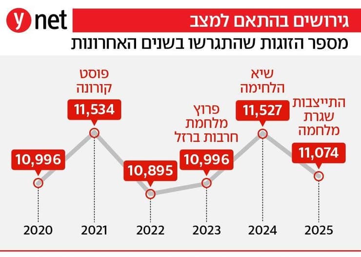 במהלך שנת 2021, שלהי תקופת הקורונה, נרשם שיא במספר המתגרשים שעמד על 11,534 זוגות. לאחר מכן הייתה ירידה. כ-10,800 זוגות התגרשו בשנים 2022 ו-2023. המגמה התחזקה בשנת 2024, אז מספר הזוגות שהתגרשו עמד על 11,527, עלייה של 6.7% מהשנה שחלפה לה. בשנת 2025 התגרשו 11,074 זוגות. הירידה ב-2025 באה עם התמתנות הלחימה אחרי שבשנת 2024 הייתה לחימה עצימה.