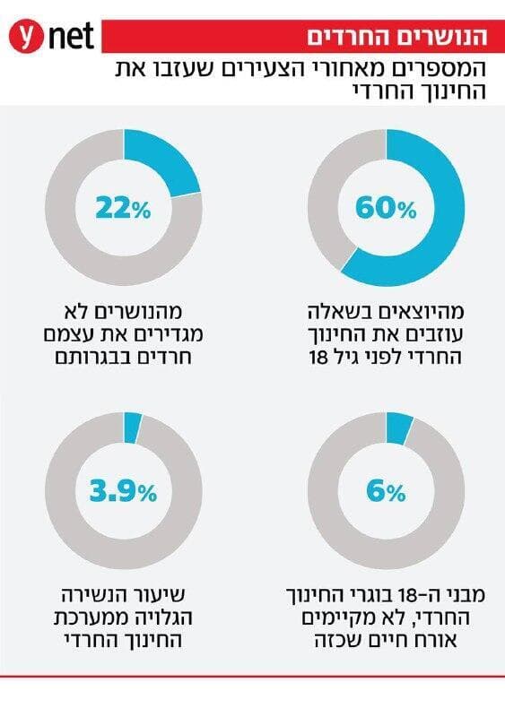 השוואה למערכת החינוך הכללי, מעלה כי שיעור הנושרים החרדים גבוה פי שלושה מהצעירים הנושרים מהמערכת הכללית. כך, בשנים 2022-2023 היו 5,506 בני נוער שלמדו בעבר במערכת החינוך החרדית, ובאותן שנים לא היו רשומים באף מסגרת. מדובר בשיעור של 3.9% נשירה לעומת 1.2% במערכת החינוך הכללי יהודי. עוד מתברר כי כאחד מכל חמישה חרדי (22%) מתוך הצעירי שנשרו מהחינוך החרדי, לא מגדירים את עצמם 'חרדים' בבגרותם.