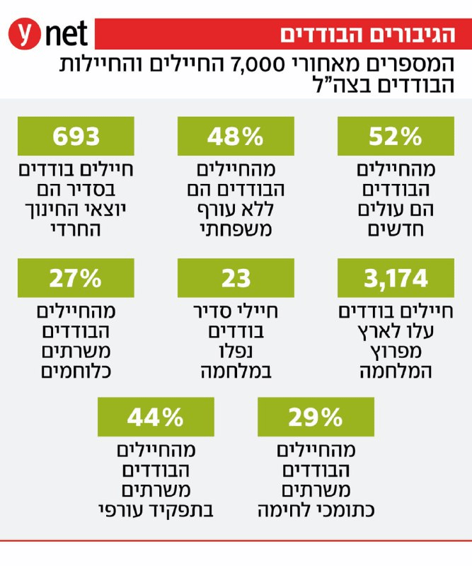 כ-7,000 חיילים וחיילות בודדים משרתים כיום בצה"ל. כמחצית מהם הם עולים חדשים, וכמחצית חסרי עורף משפחתי. ארה"ב היא המדינה ממנה עלו הכי הרבה חיילים בודדים, עם 804 כאלה. ומנגד ניצבות סינגפור, דנמרק ואוגנדה - שמכל אחת מהמדינות עלה חייל אחד. חלקם משרתים כלוחמים, חלקם כתומכי לחימה, ואחרים בתפקידים עורפיים, אך מה שמשותף לכולם, הוא הרצון המיוחד לתרום למדינה בכל מצב, למרות הקשיים.