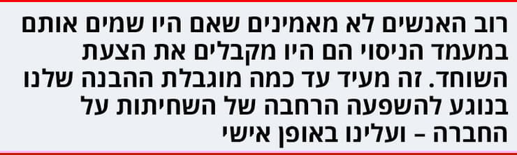 אבל כשהניסוי התחיל בהצעת שוחד, אנשים גם רימו יותר וגם גנבו. עצם זה שהצעת השוחד עלתה, השחית את המערכת. וזה הדבר המפחיד באמת: מה קורה כשיש מישהו מושחת בראש הפירמידה. כמה מהר אנחנו יכולים ללמוד את הלקח ששחיתות זה בסדר. זה מתיישב עם הרבה עקרונות פסיכולוגיים שהמסקנה שלהם היא שאנחנו לא באמת יודעים מהם החוקים של החיים – אלה הבלתי הכתובים, אבל אפילו אלה הכתובים. לרובנו אין מושג מה חוקי ומה לא, או מה העונש שצפוי על כל עבירה. יודעים שעל רצח מקבלים יותר מעל גניבה במכולת, אבל לרוב אין לנו מושג מה המחיר על כל פשע. במקום, רובנו מקבלים תובנות מהאנשים סביבנו – זוהי נורמטיביות במובן החברתי: מה האחרים עושים. אם אנחנו רואים שכל הולכי הרגל מסביב חוצים את הכביש גם כשיש אור אדום במעבר חציה, מהר מאוד נבין שזה מקובל וזה עובר. זה לא בהכרח קשור לחוקים הכתובים – זוהי הנורמה, והיא מאוד משפיעה על ההתנהגות. וזה גם מה שמטריד בניסוי שלנו. זה מפחיד כמה אנשים הסכימו לתת שוחד כשהציעו להם, וכמה מהר הם השתנו – גם מבחינת כמות הרמאות, וגם מבחינת הנכונות שלהם לגנוב.