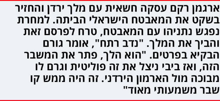 אבל למחרת נפגש נתניהו עם המאבטח, וטרח לפרסם זאת. "נתניהו התנהג כאילו הוא שיחרר איזה אסיר ציון וגיבור ישראל", אומר גורם ששוחח על הפרשה עם ארגמן. "נדב הצליח לשחרר את המאבטח בזכות קשריו עם מלך ירדן, וקבלת הפנים שנתניהו עשה לו הייתה סטירה בפניו של המלך".
