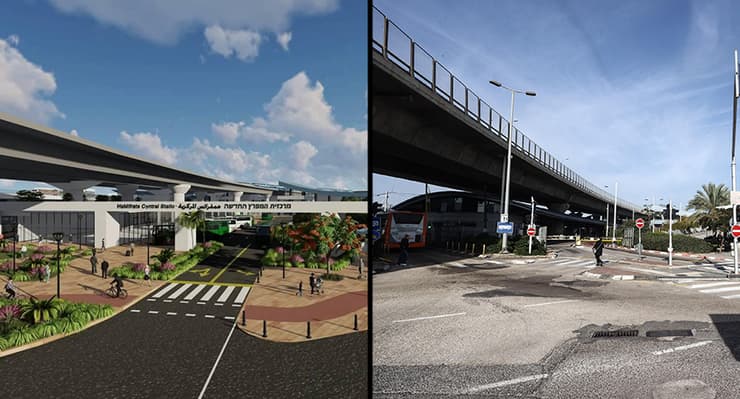 תחנת המפרץ חיפה, היום והדמיה עתידית (צילום: גיל נחושתן, הדמיה: מנספלד קהת אדריכלים, יזם: נתיבי איילון)
