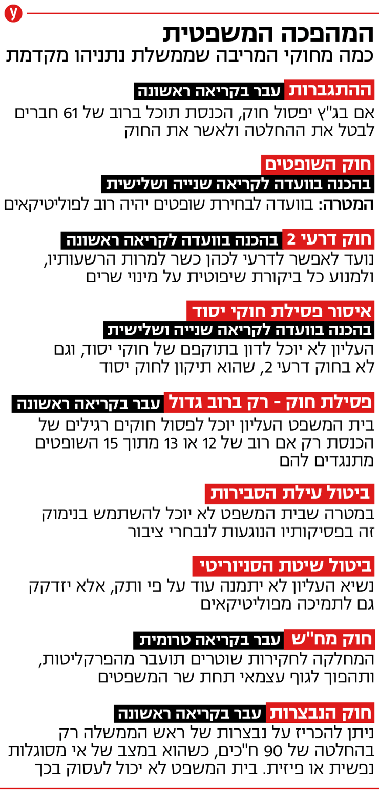 מליאת הכנסת אישרה הלילה (שבין שני לשלישי) בקריאה ראשונה וברוב של 61 תומכים מול 52 מתנגדים את חוק השפיטה, הכולל את פסקת ההתגברות ואת הגבלת בג"ץ מלפסול חוקים רגילים. מוקדם יותר מליאת הכנסת אישרה אמש (שני) בקריאה ראשונה - לאחר דיון של ארבע שעות - את חוק הנבצרות, בתמיכתם של 61 ח"כים, בהם ראש הממשלה בנימין נתניהו, מול 51 מתנגדים. משתי ההצבעות נעדר ח"כ יולי אדלשטיין מהליכוד. ynet העביר את הדיון בשידור ישיר.