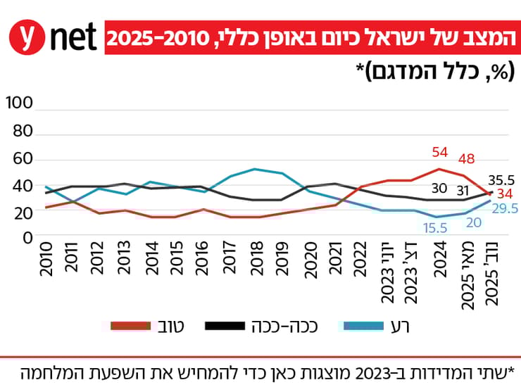 בנובמבר 2025 הישראלים נחלקים כמעט שווה בשווה בין אלו שמעריכים את מצבה של ישראל כטוב, ככה-ככה ורע. מדובר בשיפור משמעותי בהשוואה ל-2024 ולמאי 2025, אז כחצי מהישראלים הגדירו את מצבה של ישראל כרע או רע מאוד.
