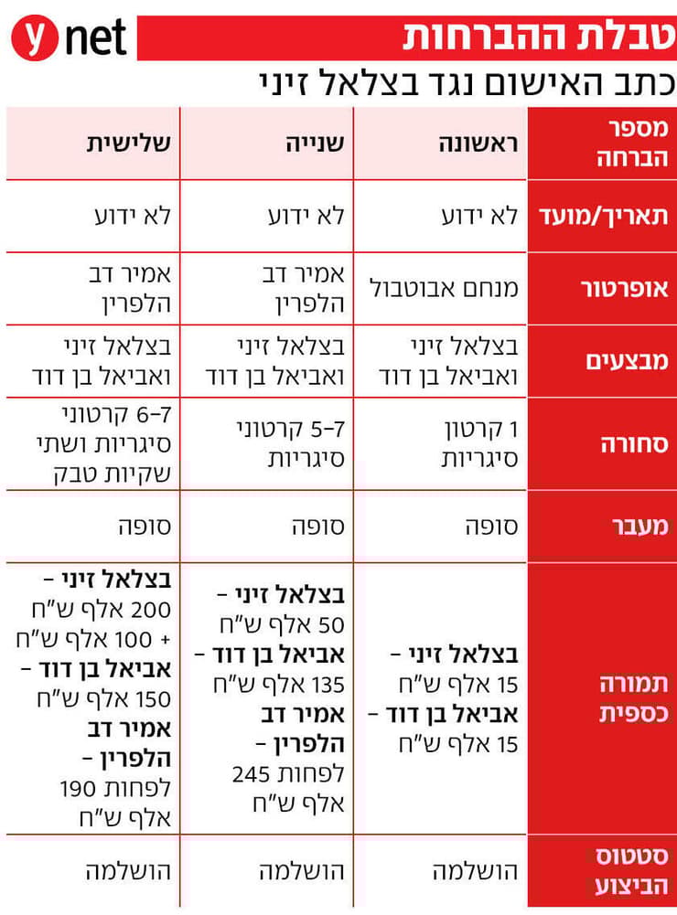 בכתב האישום תואר בין השאר כי חודש לאחר ההברחה השלישית, אמר זיני לאביאל בן דוד שיש לו מכר ביחידה 8200 שטען בפניו שעלולים לעלות עליהם - ושיש לו את היכולת לסייע להם, כך שפרטיהם לא יופיעו במערכת. בתמורה לכך, תואר, זיני הסביר שהתבקש לארגן עבור יחידתו של המכר ציוד צבאי. זיני, כך נכתב, ביקש מאביאל כ-100 אלף שקלים - וזה נעתר לבקשה והעביר לו אותם. כתב האישום לא מפרט מה עלה בגורל אותה בקשה, מה עשה זיני בכסף - ואם המכר בכלל קיים.