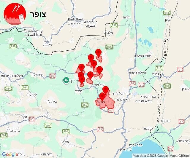 אזעקות המתריעות על ירי רקטות וטילים הופעלו בצפת - עיר, ביריה, אור הגנוז, בר יוחאי, מירון, מרכז אזורי מרום הגליל, קדיתא, אזור תעשייה רמת דלתון, ג'ש-גוש חלב ודלתון.