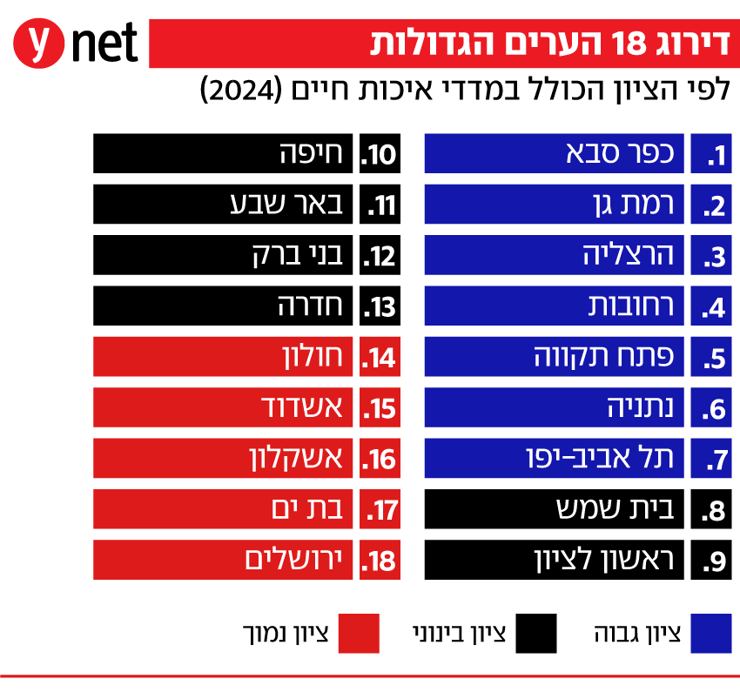 העיר אשקלון ירדה מהמקום ה-14 למקום ה-16, והיא מדורגת שנייה באחוזים הנמוכים של תחושת דיכאון ושל תחושת בדידות. העיר בת ים, שהייתה אחרונה בשנת 2023, עלתה מקום אחד ונמצאת במקום ה-17 לשנת 2024. היא מובילה באחוזים הנמוכים ביותר של תחושת דיכאון, באחוז הפסולת שהועברה למִחזור, בשביעות רצון מהתחבורה הציבורית ובאחוז הנמוך ביותר של חוסר שביעות רצון ממשך ההגעה לעבודה. את הרשימה סוגרת כאמור עיר הבירה ירושלים, שירדה מהמקום ה-17 ב-2023 למקום ה-18. ירושלים מובילה במספר הנמוך ביותר של מקרים חדשים של שאתות ממאירות (סרטן) בקרב גברים ונשים ובאיכות מי השתייה.
