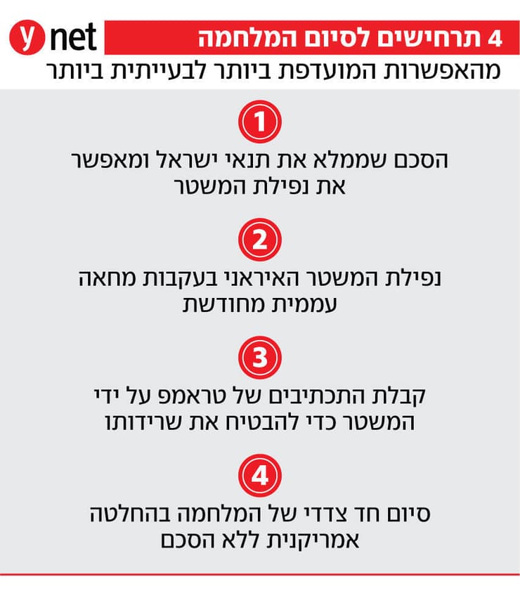 ויש עוד תרחיש בעייתי לסיום המלחמה: בהיעדר הסכם, טראמפ יודיע חד-צדדית שניצח והמלחמה הסתיימה. הוא יורה לישראל לעצור את ההפצצות. זה יהיה תרחיש בעייתי מאוד, אך ישאיר בידי ישראל וארה"ב חופש פעולה כך שאם איראן תחל לשקם את המערכות שלה - הן ישמרו לעצמן את הזכות להפציץ. הבעיה בתרחיש הזה היא שבהיעדר הסכם יהיה קושי להחזיר את המשק לשגרה ולפתוח את נתב"ג, כאשר איראן יכולה לשגר טילים מתי שתרצה.