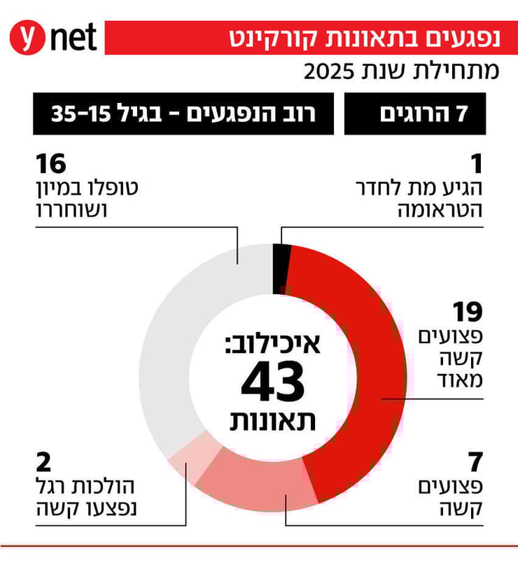 למרבה הצער, מעיין אינה היחידה שנפגעה בתאונת דרכים קשה במעורבות קורקינט. מנתוני בית החולים איכילוב בתל אביב - אחד ממוקדי הטיפול הגדולים בארץ בפצועי רכב דו-גלגלי - מתחילת השנה טופלו בחדר הטראומה 43 פצועים שנפגעו בתאונות קורקינטים חשמליים. מותו של אחד מהם נקבע בהגיעו לחדר הטראומה. 19 מבין כלל הפצועים נפצעו באורח קשה מאוד ונזקקו לניתוחים שונים, בהם ניתוחי ראש, ניתוחי בטן וניתוחים אורטופדיים מורכבים. בין הפצועים היו גם שתי הולכות רגל, בת 62 ובת 72, שנדרסו על-ידי רוכב קורקינט. השתיים נפצעו קשה ואושפזו בטיפול נמרץ.