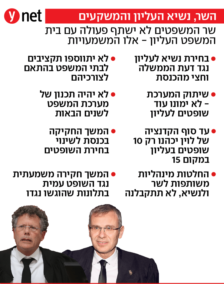 בינואר 2023 הכריז לוין על המהפכה המשפטית, שמטרתה לשנות את היחסים עם העליון. בית המשפט תופס את הצעות השר כסכנה לעצמאותו ולדמקורטיה. בחצי השנה האחרונה 33 ניסיונות מצד לוין להגיע לפשרה לגבי בחירת שופטים ונשיא לעליון לא נענו, ויותר מכך: בג"ץ הכריח אותו למנות בניגוד לרצונו, לדרך בה הוא תופס את סמכותו כשר משפטים וכיו"ר הוועדה לבחירת שופטים.