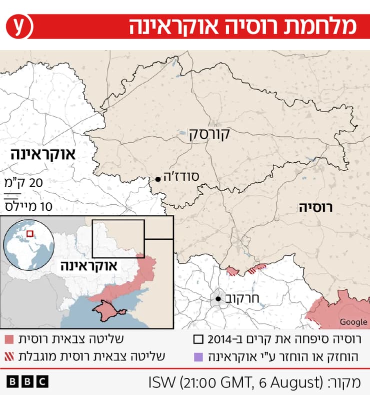 הפלישה האוקראינית למחוז קורסק שברוסיה, נזכיר, אירעה ביום שלישי שעבר: לפי רוסיה, כוח של כ-1,000 לוחמים אוקראינים הסתער על המחוז עם טנקים ונגמ"שים בחיפוי כטב"מים וארטילריה, ותפס את הכוחות הרוסיים לא מוכנים. אף שמאז פרוץ המלחמה ב-2022 נרשמו כמה אירועים שבהם כוחות אוקראיניים קטנים פלשו לשטח רוסיה, הפלישה ביום שני הייתה יוצאת דופן בגודלה ובעומקה, והיא ללא ספק המשמעותית ביותר עד כה מצד צבאו של זלנסקי. גורם אוקראיני רשמי בכיר טען היום כי בפלישה השתתפו "אלפי חיילים", ולא 1,000 בלבד כפי שטענה מוסקבה.