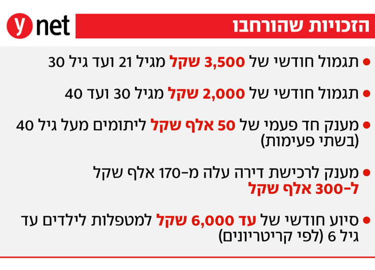 במסגרת החוק, אושרה העלאת גיל היתמות ל-30, והרחבת טווח הגילאים שבהם זכאים יתומי צה"ל וכוחות הביטחון לתגמולים חודשיים עד גיל 40. בין היתר נקבעו תגמולים חודשיים ליתומים בוגרים בגילאי 30-21 בסכום של כ-3,600 ש"ח לחודש, וליתומים בגילאי 40-30 בסכום של 2,000 ש"ח לחודש. יתומים בני 40 ומעלה ביום כניסת החוק לתוקף יקבלו מענק חד-פעמי בסך 50,000 ש"ח בשתי פעימות - האחת מיידית והשנייה בגיל 60. גם יתומים שגילם 39-30 ביום כניסת החוק לתוקף יהיו זכאים למענק, כשהפעימה הראשונה תועבר עם הגיעם לגיל 40.