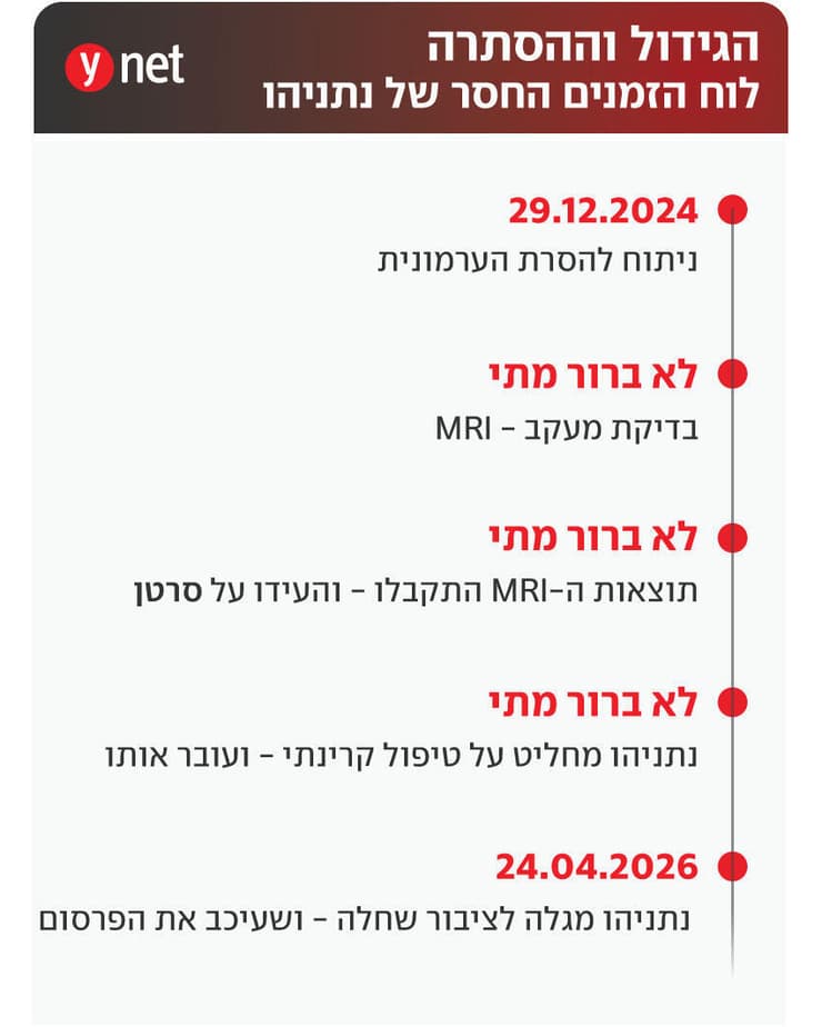 לפי הגרסה שסיפק ראש הממשלה, ב-29 בדצמבר 2024 הוא עבר ניתוח להסרת ערמונית מוגדלת. לאחר אותו ניתוח אמרו רופאיו כי "אין חשד לממאירות או לסרטן". מאז חלפו כמעט שנה וארבעה חודשים, ובתוכם - עבר נתניהו בדיקת MRI למעקב, קיבל תוצאות שהעידו על גידול סרטני - וגם עבר הקרנות. לא ברור מתי הן התרחשו, אולם נתניהו בעצמו אמר כי מדובר היה ב"כמה טיפולים".