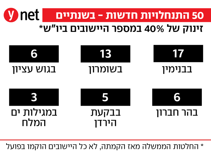 מתחילת הקדנציה הקימה הממשלה 50 יישובים ביהודה ושומרון, בארבע החלטות שונות: 17 יישובים חדשים בבנימין, 13 בשומרון, 6 בהר חברון, 6 בגוש עציון, 5 בבקעת הירדן ועוד 3 יישובים במגילות ים המלח. עד הממשלה הנוכחית היו ביו"ש 128 יישובים מוכרים, וכעת, עם ההחלטות החדשות, יהיו 178 יישובים. מדובר בזינוק של 40% בשנתיים. מה שדרש עשרות שנים בעבר קורה כעת בשנים בודדות, ולמעשה נותרו לביצוע רק הליכים תכנוניים, ואין במסלול הכשרת היישובים שום "הליך מדיני".