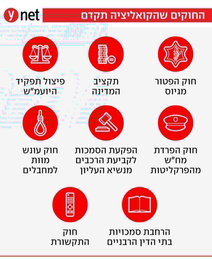 אלא שלצד זאת, בקואליציה קבעו תעדוף לחוקים נוספים - והראשון שבהם קשור למערכת המשפט. הניסיון למהפכה משפטית אומנם טלטל את המדינה ופיצל אותה לשניים, אך בחודשים האחרונים חוזר לסדר היום מאחר שהוא חשוב לבייס הימני לקראת הבחירות.