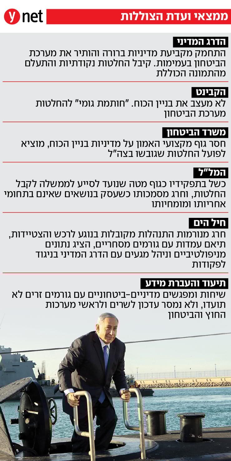 לפי הוועדה, "במדינה דמוקרטית האחריות לביטחון המדינה ולניהול הסיכונים הביטחוניים מוטלת על נבחרי הציבור - הדרג המדיני. מערכת הביטחון היא הגורם שמבצע את מדיניות הממשלה. למרות זאת, לאורך שנים ממשלות התחמקו מקביעת מדיניות ברורה שתטיל עליהן אחריות והותירו את מערכת הביטחון בעמימות. במקום לקבוע מדיניות ואסטרטגיה קיבלו הממשלות החלטות נקודתיות והתעלמו מהתמונה הכוללת של צורכי הביטחון באופן שסיכן את ביטחון המדינה.