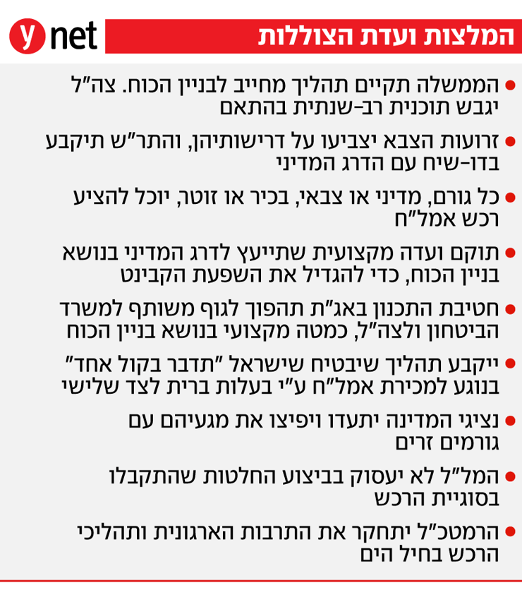 עוד נכתב כי הוועדה מצאה ש"למרות אחריותו, הקבינט אינו מעצב את בניין הכוח. חברי קבינט מסרו לוועדה שהם היו 'חותמת גומי' להחלטות שהתקבלו על-ידי מערכת הביטחון. כדי להגדיל את השפעת הדרג המדיני על קבלת ההחלטות, הוועדה ממליצה להקים ועדה קבועה שתייעץ לדרג המדיני בנושא בניין הכוח. הוועדה, שתורכב מאנשי מקצוע שימונו על ידי ראש הממשלה, שר הביטחון ושר האוצר, תסייע לאתגר את עמדות מערכת הביטחון, תפקיד שהמל"ל כשל בו".