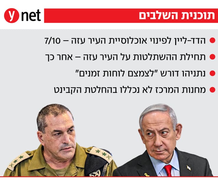 לפי התכנון צה"ל ישתלט על העיר עזה אחרי השלמת פינוי האוכלוסייה, וכשבעיר אמורים להישאר רק מחבלי חמאס. "נאפשר לאזרחים מסדרון יציאה מסודר ובטוח, וסיוע הומניטרי מחוץ לאזורי הלחימה", הוסיף ראש הממשלה.