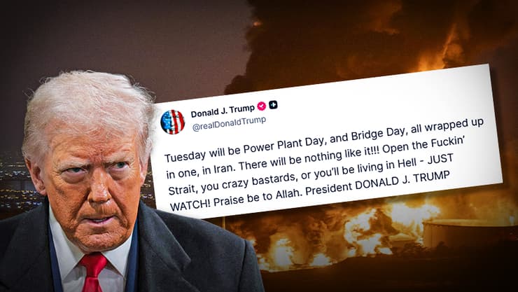 בפוסט בוטה במיוחד ברשת החברתית שלו כתב טראמפ: "יום שלישי הקרוב יהיה יום תחנות הכוח ויום הגשרים באיראן, הכול בחבילה אחת. לא יהיה שום דבר דומה לזה!!! תפתחו את המצר המזד**ן, ממזרים משוגעים שכמותכם, או שתחיו בגיהינום – רק תסתכלו! השבח לאללה". מעט לאחר מכן אמר טראמפ ל"פוקס ניוז" שהוא מאמין שניתן להגיע להסכם עד מחר, ושכעת מתנהל מו"מ. "אם הם לא יגיעו להסכם, ומהר, אני שוקל לפוצץ הכול ולהשתלט על הנפט", אמר. טראמפ טען שהנציגים האיראנים שמנהלים את המו"מ קיבלו "חנינה מוגבלת". בתחילת המלחמה, נזכיר, הבטיח טראמפ שארה"ב תעניק חנינה לאנשי המשטר שיתקוממו נגד שלטון האייתוללות.