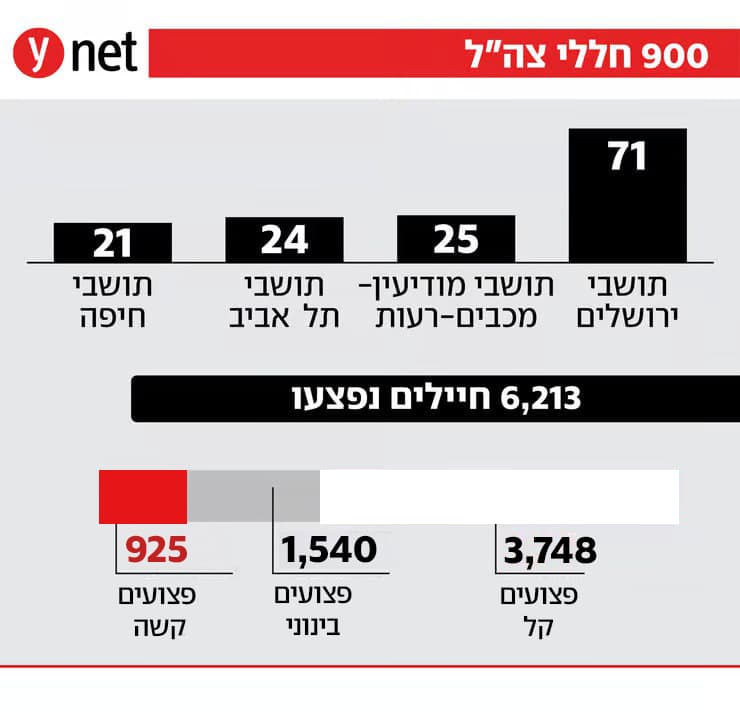 המספר 900, נדגיש, לא כולל את השוטרים, אנשי הימ"מ ושב"כ שנפלו מאז 7/10. מתחילת המלחמה נהרגו גם 82 אנשי גופי הביטחון שאינם כוללים את צה"ל - 67 מהמשטרה וממג"ב, שישה מהשב"כ (ארבעה נופלים נוספים ב-7 באוקטובר ששירתו בשב"כ גויסו למילואים ומוגדרים כחללי צה"ל), חמישה מכבאות והצלה, שלושה ממד"א ואחד מהשב"ס.