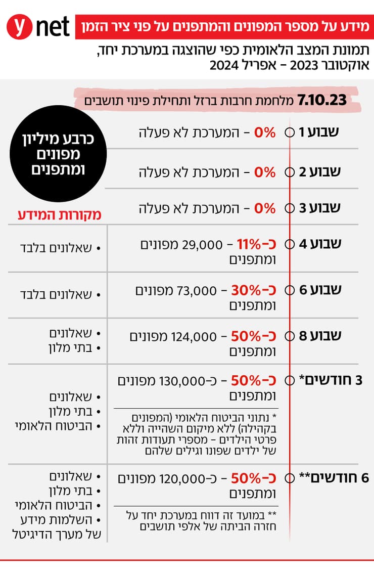 רק בחלוף כחצי שנה מאז פרוץ המלחמה, ציין המבקר, "נאסף מידע עדכני (במערכת יחד) רק על כ-50% מהמפונים והמתפנים". הוא הוסיף כי "הוצאות המדינה למימון עלויות שהותם של המפונים בבתי המלון ובבתי הארחה הגיעו לכ-5.26 מיליארד שקל עד סוף יולי 2024. ואולם בביקורת עלה כי מידע על המפונים הגיע רק מבתי המלון ולא מגוף ממשלתי שאסף את המידע מהמפונים עצמם. בכך נמנעה היכולת לבצע בקרה אפקטיבית ואף בזמן אמת על תשלומי הממשלה לבתי המלון".