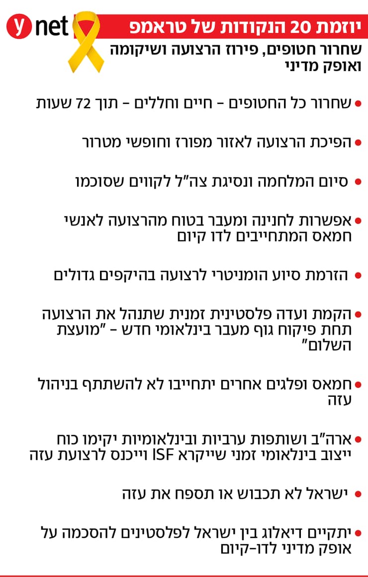 ״אנחנו נמצאים בשלב הראשון של המתווה״, אמר הגורם הבכיר, ״צה״ל נשאר בעזה - והנסיגה תהיה רק לקו הצהוב ולכיתור של העיר עזה בקבלת החטופים. בשלב הראשון משחררים את כל החטופים ונשארים בתוך עזה. אף אחד לא נסוג כרגע, הנסיגה תהיה בשלב של שחרור כל החטופים לקו הצהוב, המפה צורפה למתווה טראמפ עצמו, ומשם נמשיך את המו"מ".