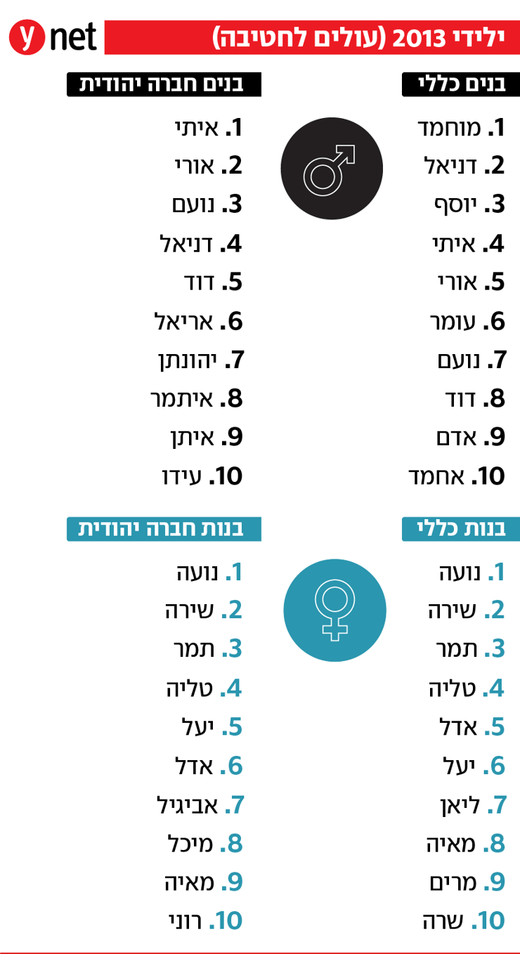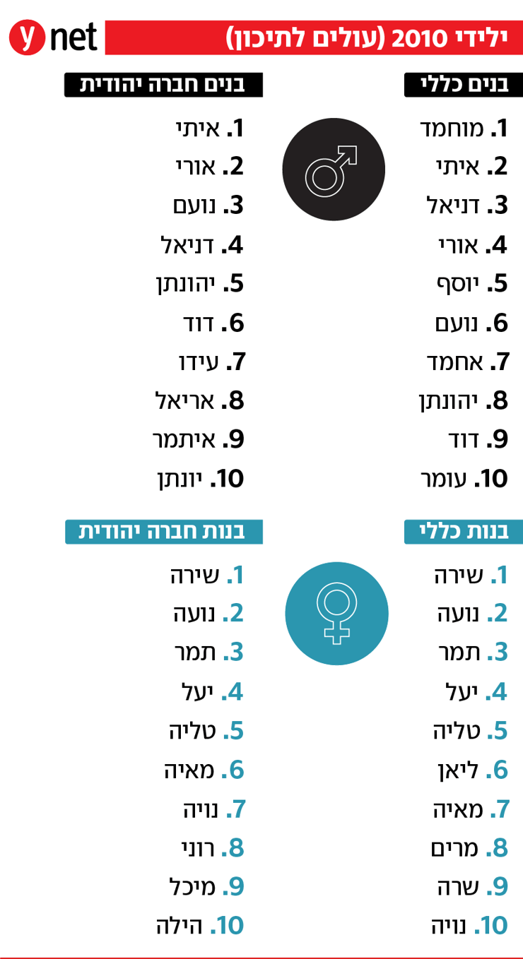 בקרב כלל האוכלוסייה, השמות הפופולאריים ביותר לבנים שעולים לתיכון - ילידי 2010 - הם מוחמד, איתי, דניאל, אורי ויוסף. בחברה היהודית נרשמת חמישייה מעט שונה: איתי, אורי, נועם, דניאל ויהונתן. אצל הבנות, חמשת השמות הפופולאריים זהים בכלל האוכלוסייה: שירה, נועה, תמר, יעל וטליה.