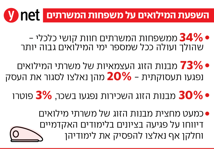 בין היתר, 73% מבנות הזוג העצמאיות של משרתי המילואים נפגעו תעסוקתית, וכ-20% מהן נאלצו לסגור את העסק; 34% ממשפחות המשרתים חוות קושי כלכלי בעקבות הגיוס, שהולך ועולה ככל שמספר ימי המילואים גבוה יותר; וכמעט מחצית מבנות הזוג של משרתי מילואים דיווחו על פגיעה בציונים בלימודים האקדמיים, וחלקן אף נאלצו לדחות קורסים או להפסיק את לימודיהן.