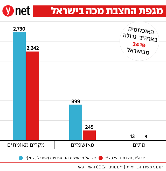 בכל ארה"ב בשנת 2025 מתו שלושה בני אדם מחצבת, לפי נתוני ה-CDC. ארה"ב היא מדינה עם יותר מ-340 מיליון בני אדם. יש מדינות רבות בארה"ב עם תוחלת חיים נמוכה יותר מתוחלת החיים בישראל. חיות שם כל מיני דתות, כיתות וקבוצות, וחלקן אפילו לא רוצות לחסן את ילדיהן והן קיצוניות למדי; מיותר לציין שיש שם עושר של קהילות חרדיות, מכל המינים והגוונים. באיחוד האירופי מתו ב-2024 סה"כ 38 בני אדם מחצבת; חיים שם 450 מיליון בני אדם, פי 45 מבמדינת ישראל. באיחוד יש אזורים, בייחוד במזרח ומרכז אירופה, עם מערכת רפואה כושלת לחלוטין, מפגרת. מערכת הבריאות בישראל טובה יותר מזו של כמעט כל מדינה באירופה. הקטלניות בהתפרצות הישראלית היא יוצאת דופן במערב.