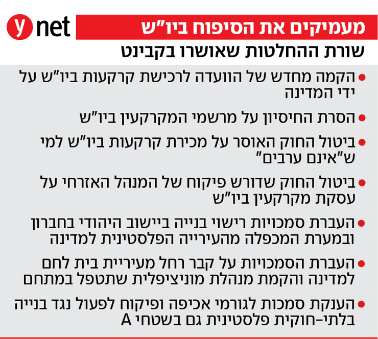 רצף החלטות הקבינט שנחשפו שלשום ב-ynet, ושעוררו זעם בעולם הערבי – הן דרמטיות ומשפיעות על מרקם החיים החדש שהולך ונבנה באזור. בין היתר, חשפנו כי ההחלטות שאושרו צפויות להביא לשינויים עמוקים בנוהלי המקרקעין והרכישות ביהודה ושומרון, כך שיאפשרו למדינה להרוס מבנים בבעלות פלסטינית בשטחי A.